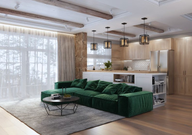 This eco-style house was created for a family with healthy habits: the twins are football fans, their apartment fully reflects this passion and encourages them to keep training; parents are nature lovers, love jogging, active sports and really appreciate the opportunity to relax in the spa. The living room filled with light and color, wood and stone support the theme of the forest and unity with nature.